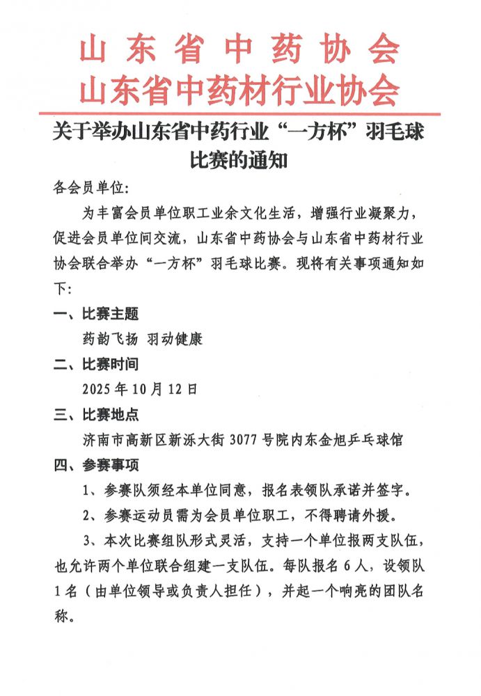 关于举办山东省中药行业“一方杯”羽毛球比赛的通知