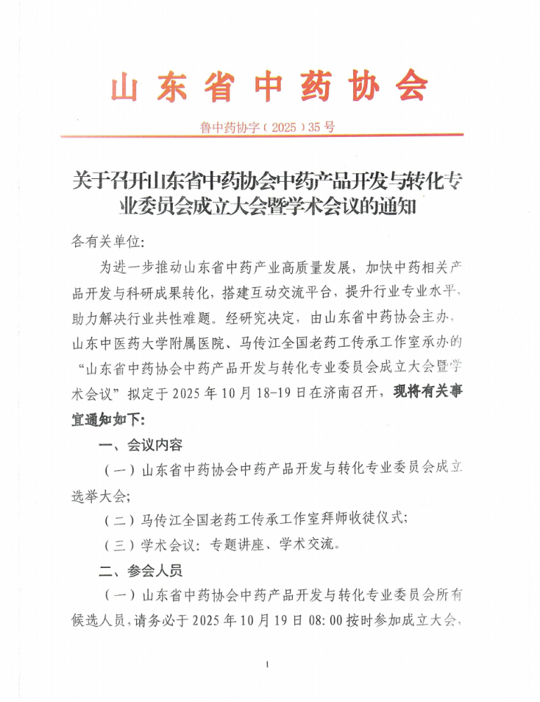关于召开山东省中药协会中药产品开发与转化专业委员会成立大会暨学术会议的通知