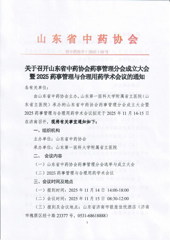 关于召开山东省中药协会药事管理分会成立大会暨2025药事管理与合理用药学术会议的通知