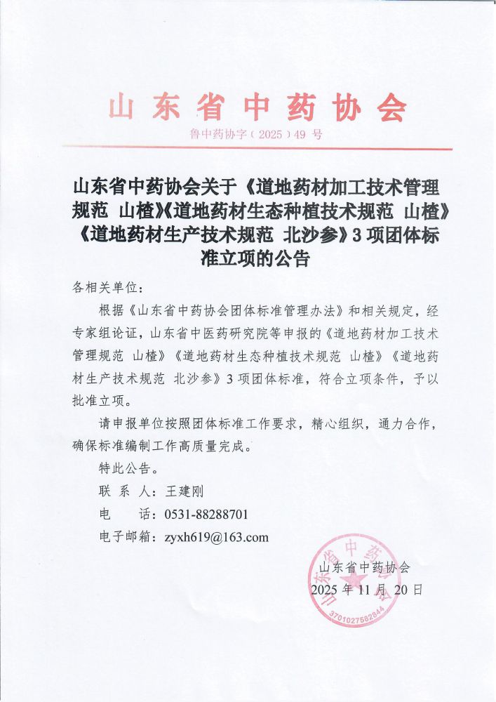 关于《道地药材加工技术管理规范 山楂》《道地药材生态种植技术规范 山楂》《道地药材生产技术规范 北沙参》3项团体标准立项的公告