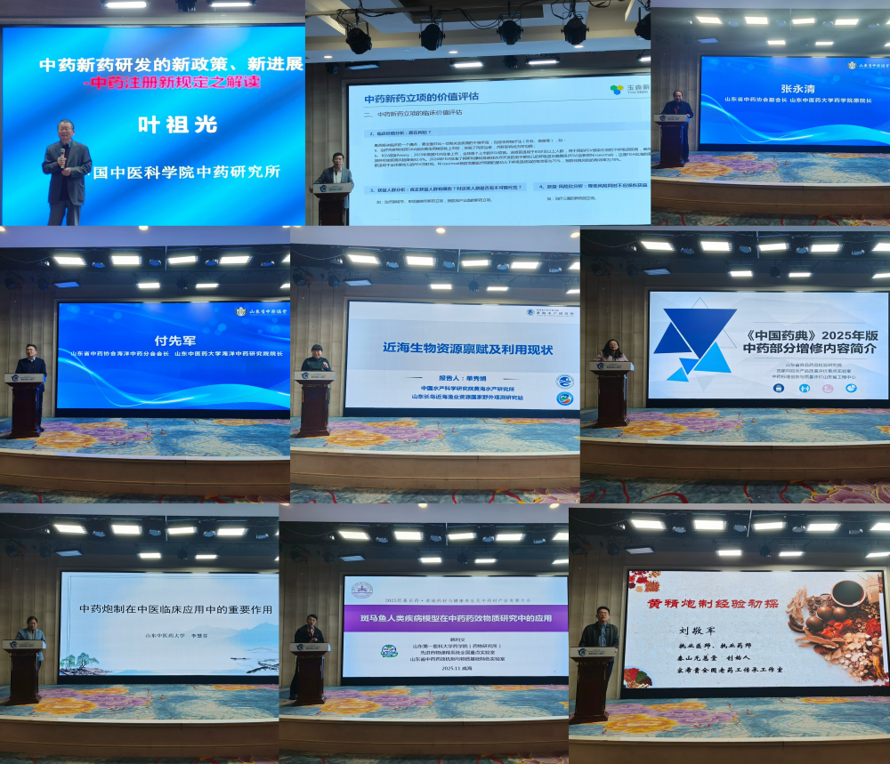 中国中医科学院叶祖光研究员、苏州大学玄振玉教授、山东中医药大学张永清教授、山东中医药大学付先军教授、中国水产科学研究院黄海水产研究所单秀娟研究员、山东省食品药品检验研究院汪冰主任、山东中医药大学李慧芬教授、山东第一医科大学韩利文教授、泰安市泰山景区无恙堂健康产业有限公司刘敬军总经理,分别就中药新药研发的新政策、新进展—中药注册审批新规定、院内制剂的新药转化路径及立项评估、山楂产业发展研究、山东省海洋中药产业发展现状及机遇、海洋生物资源利用现状、2025年版〈中国药典〉中药部分增修内容简介、中药炮制在中药临床应用中的重要作用、斑马鱼人类疾病模型在中药药效物质研究中的应用、黄精炮制经验初探进行专题报告。