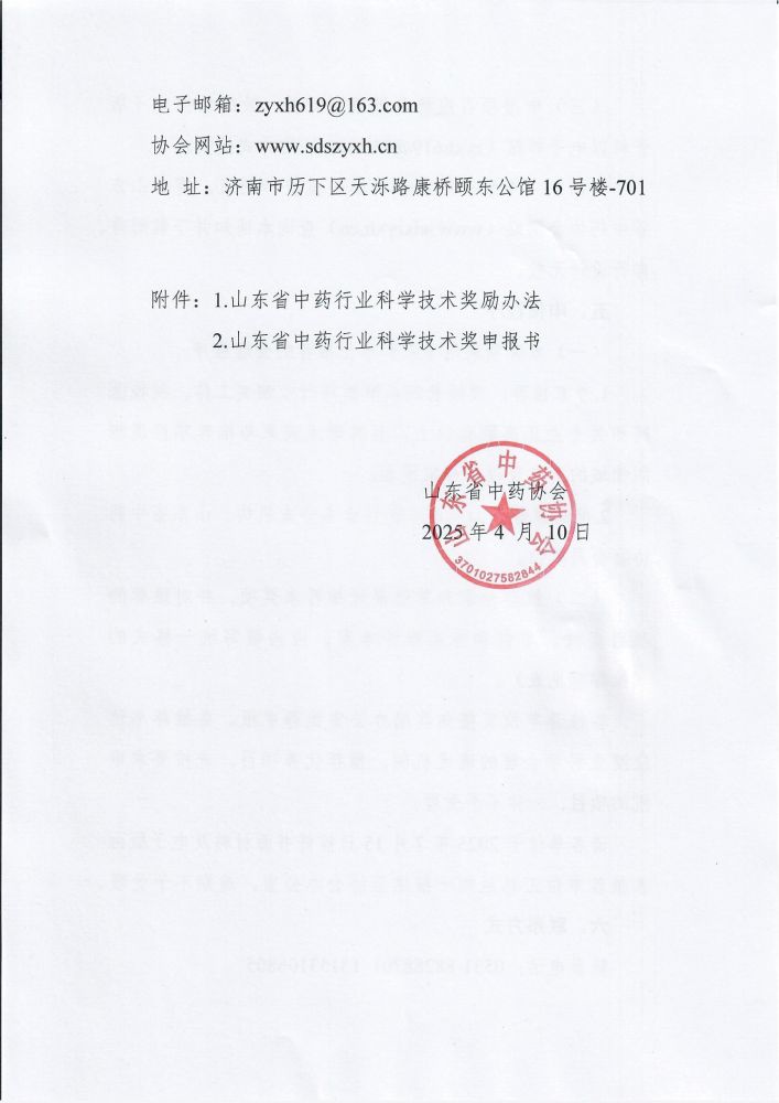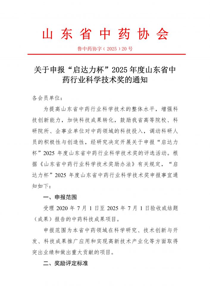 关于申报“启达力杯”2025年度山东省中药行业科学技术奖的通知